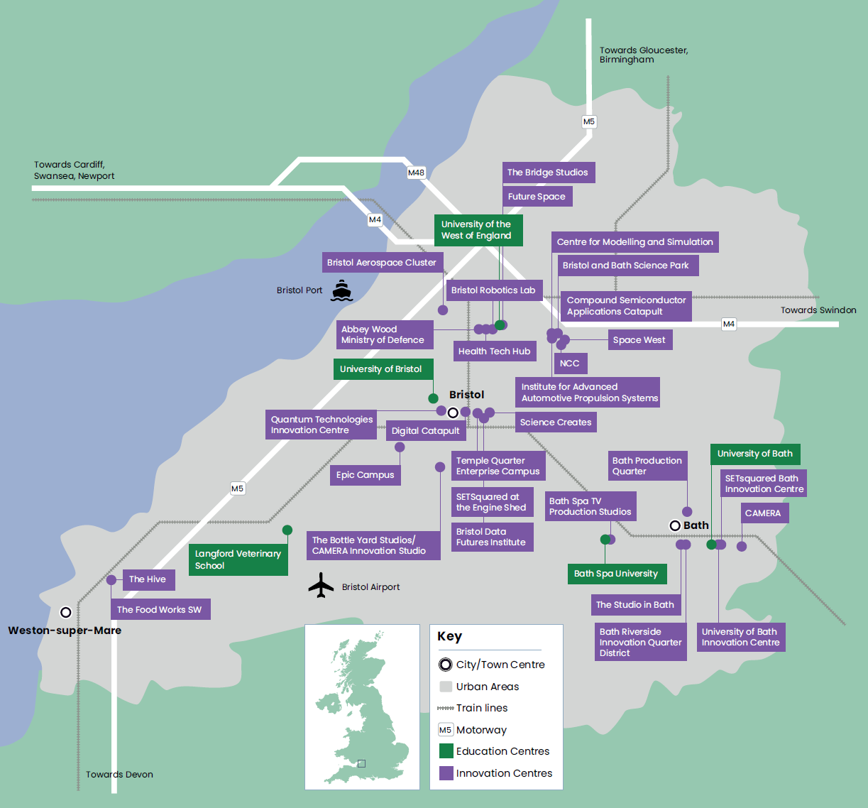 Map showing major innovation and education centres across the West of England region.